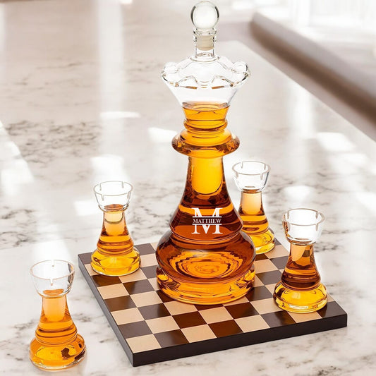 Monogram Personalized Chess Whiskey Decanter with Chess Piece Whiskey Glasses Gift Set