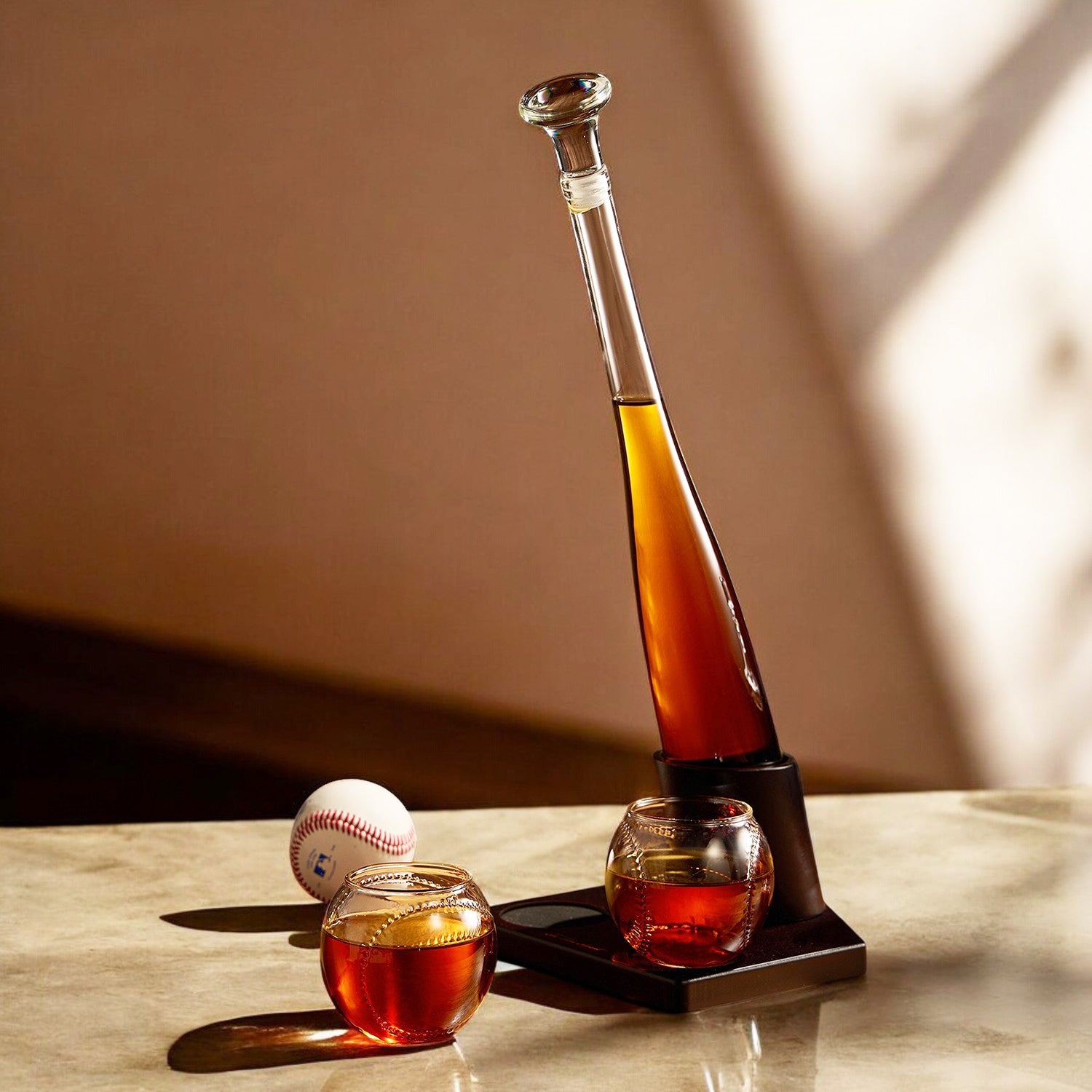 • Includes baseball bat shaped decanters, 2 baseball-theme glasses and stand