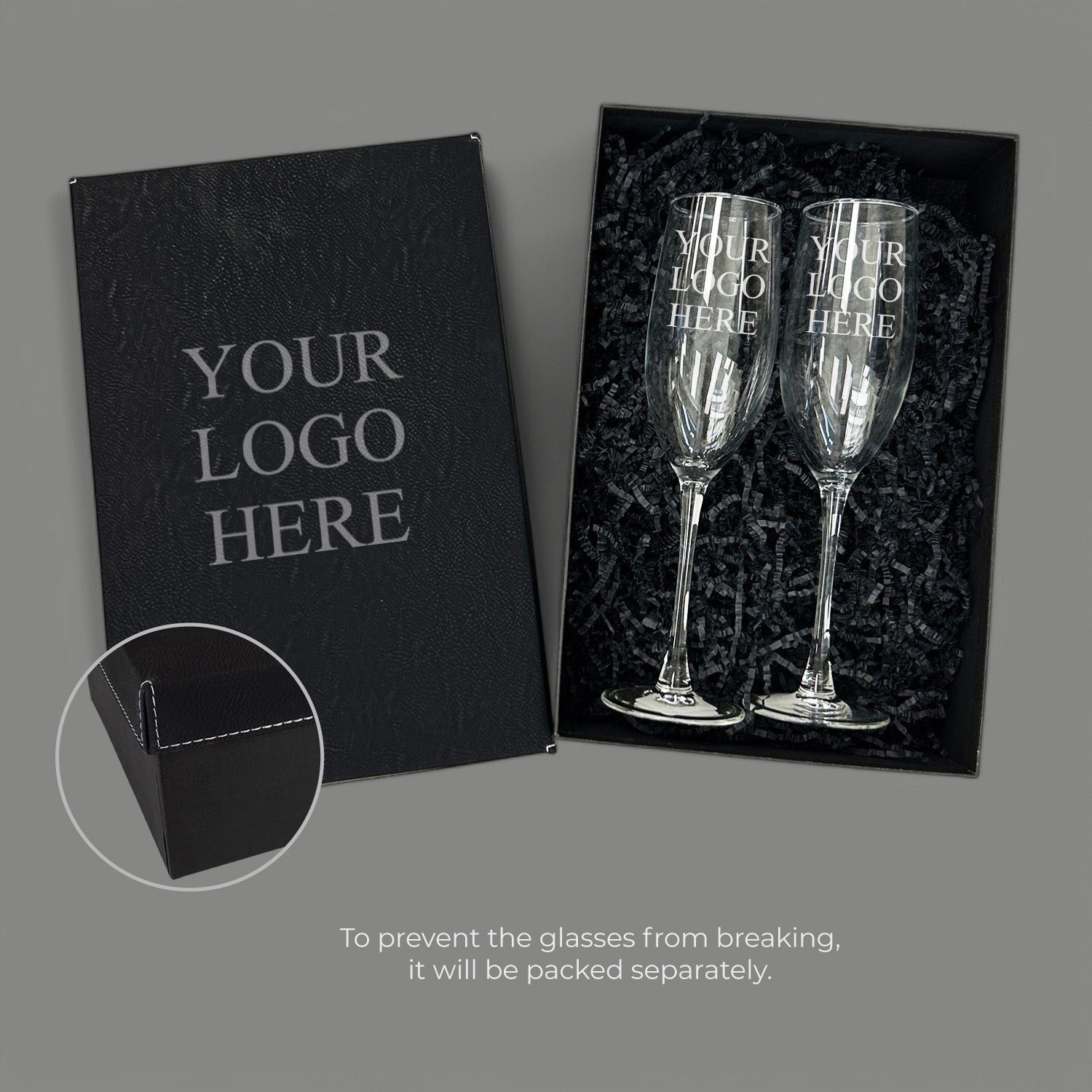 Elevate any celebration with our Personalized Champagne Gift Set, featuring two elegant champagne flutes presented in a refined engraved leather gift box. Crafted for both style and function, this set is perfect for commemorating milestones, sharing a toast, or showcasing your brand with a custom logo.