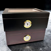 The Cigar Humidor 50 Count is a sophisticated and functional storage solution for cigar enthusiasts who value both preservation and presentation. Crafted with a sleek black painted finish, it features a premium glass top with an intricately etched design, allowing for engraved personalization. The interior is lined with high-quality Spanish cedar to maintain optimal humidity, while an adjustable divider helps organize your collection. A built-in gold-trimmed hygrometer, internal locking hinges, and a secure humidifier ensure your cigars stay fresh and well-maintained, making this humidor an excellent gift for any cigar aficionado.