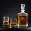 Set includes a distinguished decanter and two matching whiskey rocks glasses, each elegantly engraved with the same personalized design.