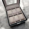 • Matte black wood, glass top, velour lining.