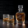 Set includes a distinguished decanter and two matching whiskey rocks glasses, each elegantly engraved with the same personalized design.