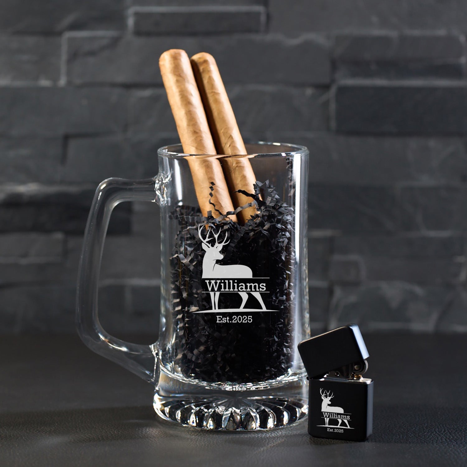 The engraved cigar lighter features a bold hunting-themed design, personalized for a unique touch, while the oversized beer mug offers a solid grip and tough presentation — perfect for celebrating after a long day in the woods. Whether it’s for birthdays, holidays, or post-hunt hangouts, this set delivers personalized style with down-to-earth functionality.