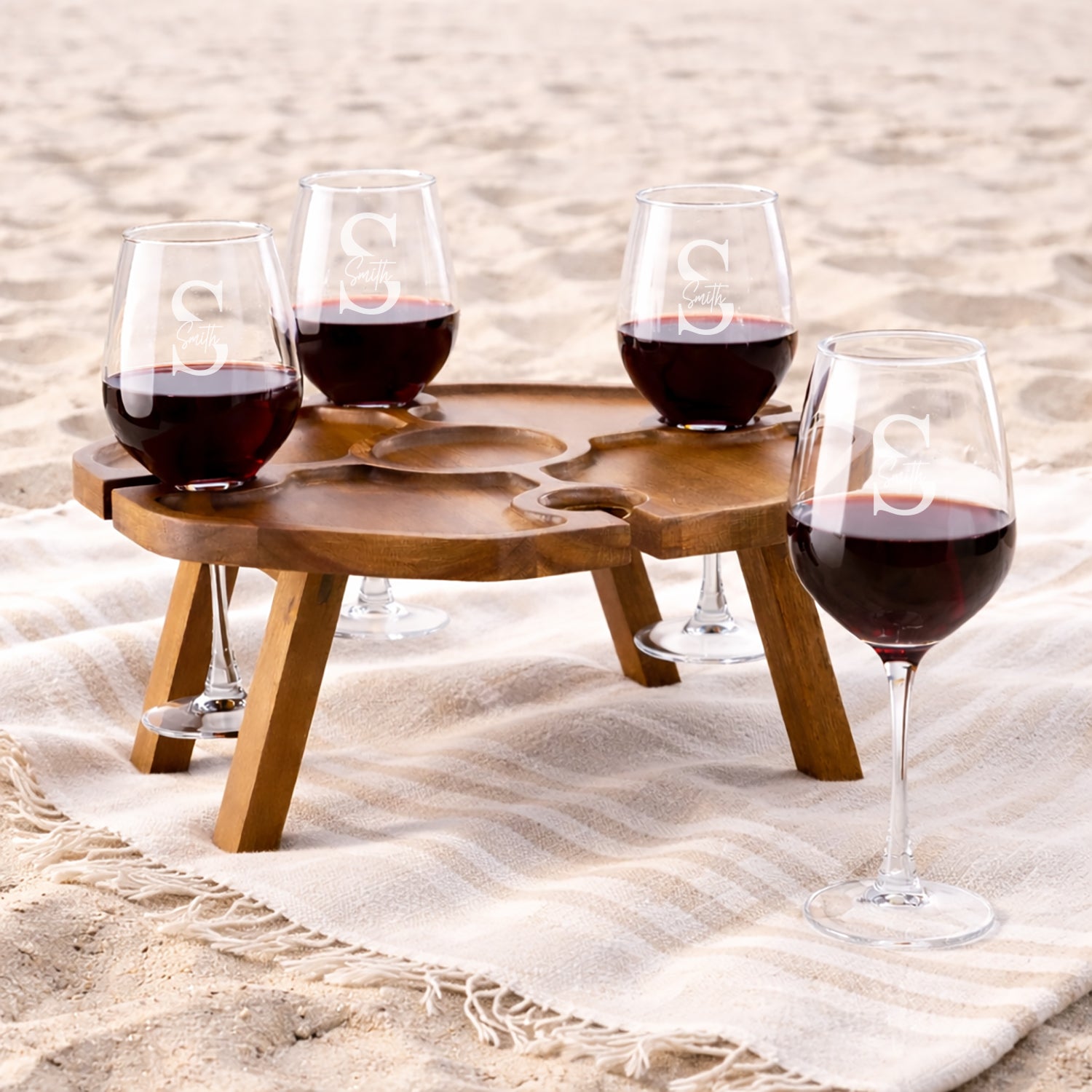 Monogram Personalized Wood Portable Wine Glasses Table , Set of 5