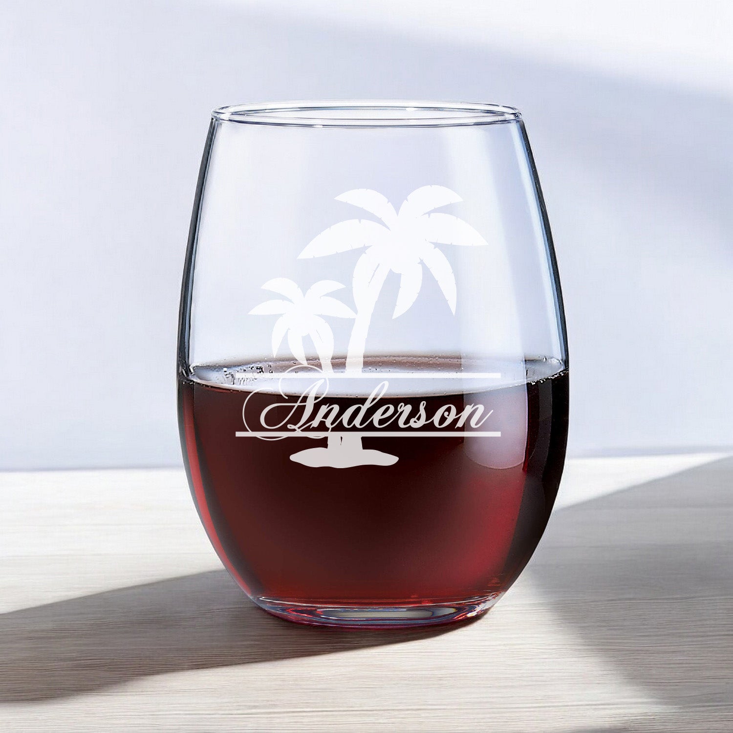 Palm Tree Personalized Wine Decanter with Stemless Wine Glass Set