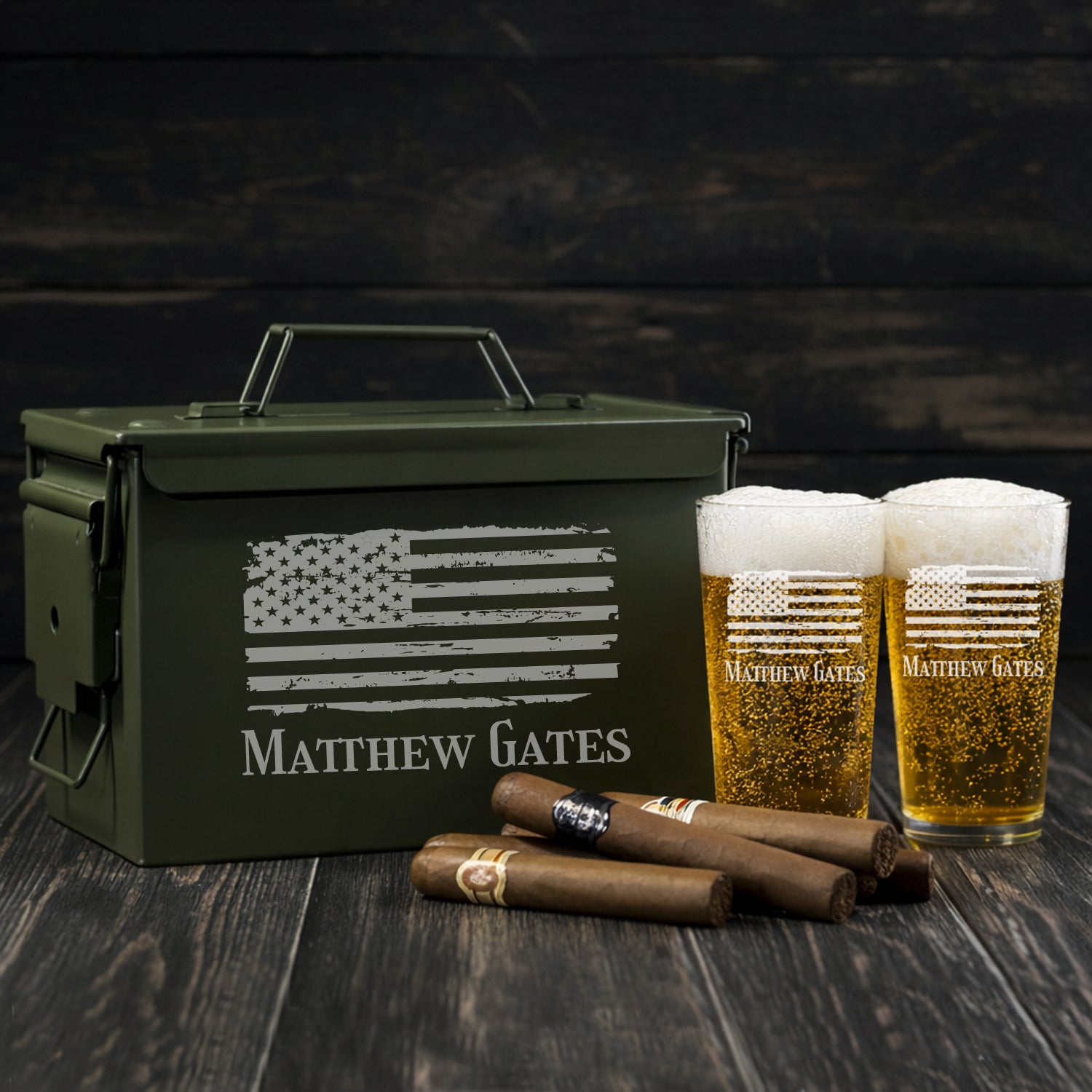 Custom. Rugged. Unapologetically American. Celebrate service, honor, and patriotism with a gift that’s as bold as the hero who receives it. Our Patriotic Military Personalized Engraved 50 Caliber Ammo Box with Pint Glasses Set combines authentic military history with precision engraving to create a one-of-a-kind keepsake they’ll treasure forever.