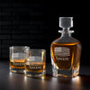 Set includes a distinguished decanter and two matching whiskey rocks glasses, each elegantly engraved with the same personalized design.