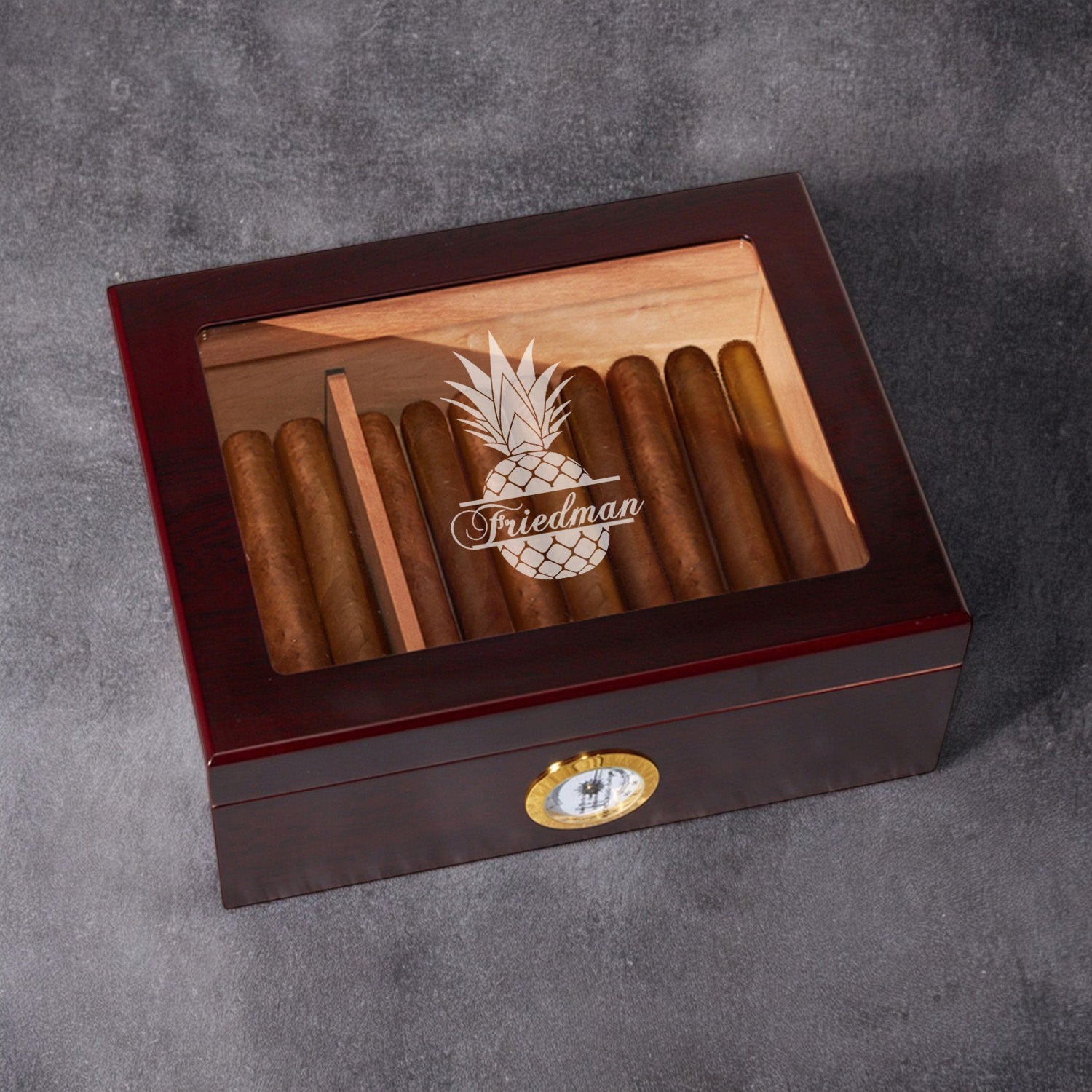 The Cigar Humidor 50 Count is a sophisticated and functional storage solution for cigar enthusiasts who value both preservation and presentation. Crafted with a sleek black painted finish, it features a premium glass top with an intricately etched design, allowing for engraved personalization. The interior is lined with high-quality Spanish cedar to maintain optimal humidity, while an adjustable divider helps organize your collection. A built-in gold-trimmed hygrometer, internal locking hinges, and a secure humidifier ensure your cigars stay fresh and well-maintained, making this humidor an excellent gift for any cigar aficionado.