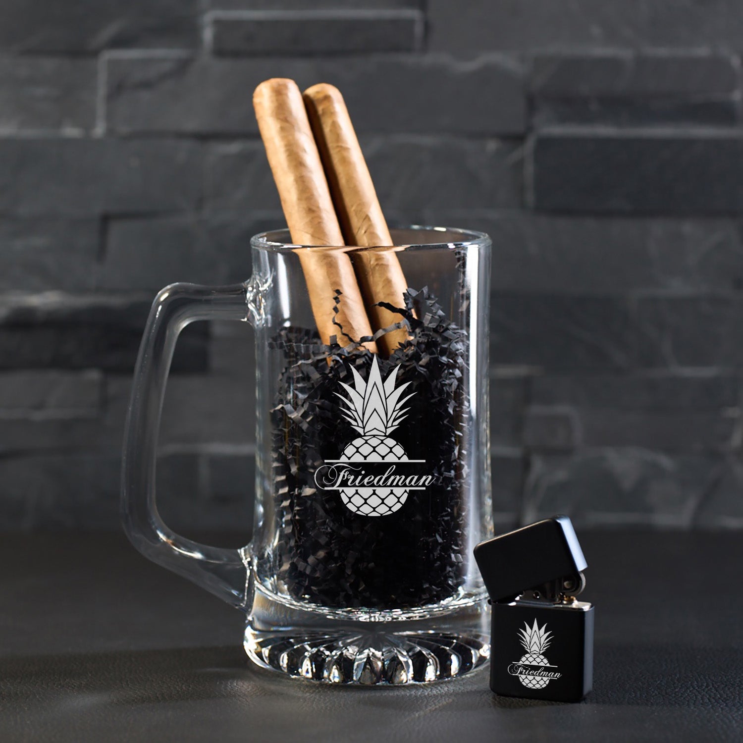 Add a tropical twist to your gift-giving with this Pineapple Personalized Cigar Lighter & Super Size Beer Mug Set. Featuring a playful pineapple design and custom engraving, this set brings laid-back island vibes to every smoke and sip.