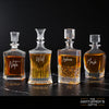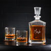 Set includes a distinguished decanter and two matching whiskey rocks glasses, each elegantly engraved with the same personalized design.